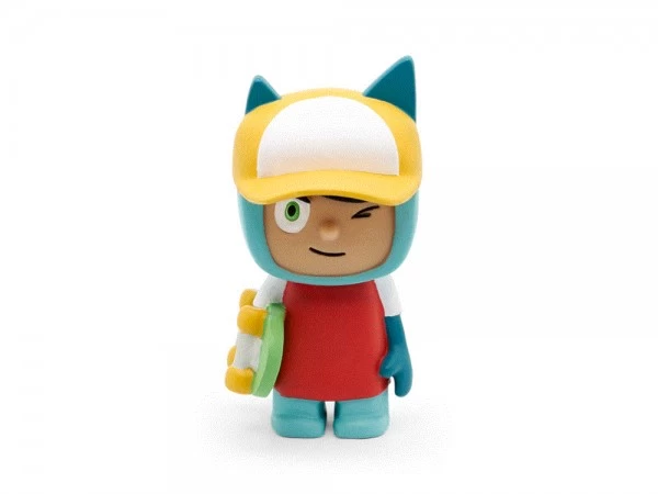 Der Kreativ-Tonie Skater trägt sein Skateboard unterm Arm. Mit T-Shirt und Schirmmütze kommt richtiger Skater-Flare auf.